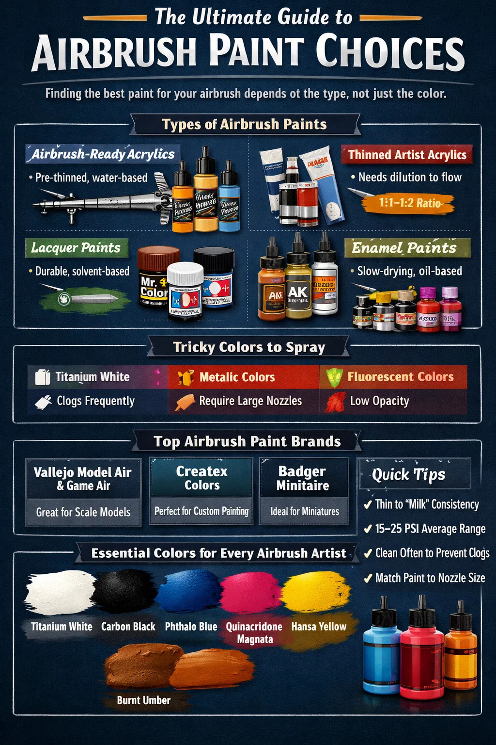 Herhangi bir sapma olmadan doğrudan bir yanıt istiyorsanız - airbrush'a hazır akrilik boyalar çoğu airbrush kullanıcısı için her yönüyle en iyi seçimdir İster ölçekli modeller, özel spor ayakkabılar, pasta sanatı, vücut boyama veya güzel sanatlar tuvalleri boyuyor olun. Su bazlıdırlar, toksik değildirler, çabuk kururlar ve airbrush nozullarından tıkanmadan akmaya yetecek kadar ince pigment parçacıklarıyla formüle edilmişlerdir. Vallejo, Createx ve Badger Minitaire gibi markalar bu kategorinin başında yer alıyor.