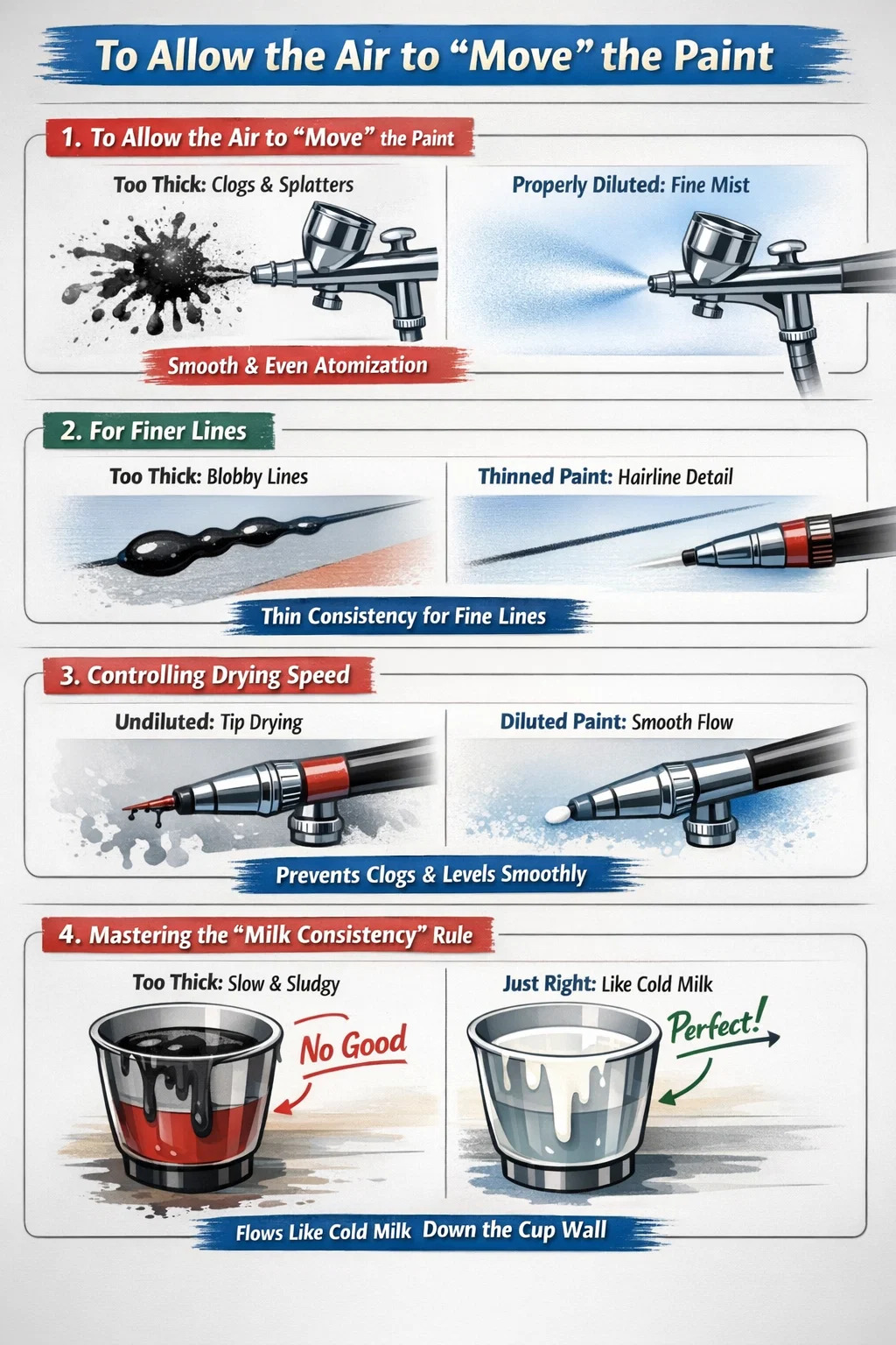 "Ucun kurumasını" önleme: Seyreltilmezse, boya genellikle nesnenin yüzeyine ulaşmadan iğne ucunda kurur. Bu, airbrushın giderek daha fazla tıkanmasına neden olur.