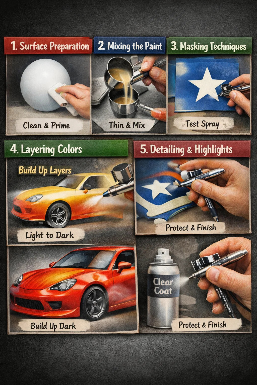 Airbrush boyama genellikle "önce açık renkler, sonra koyu renkler" mantığını izler.