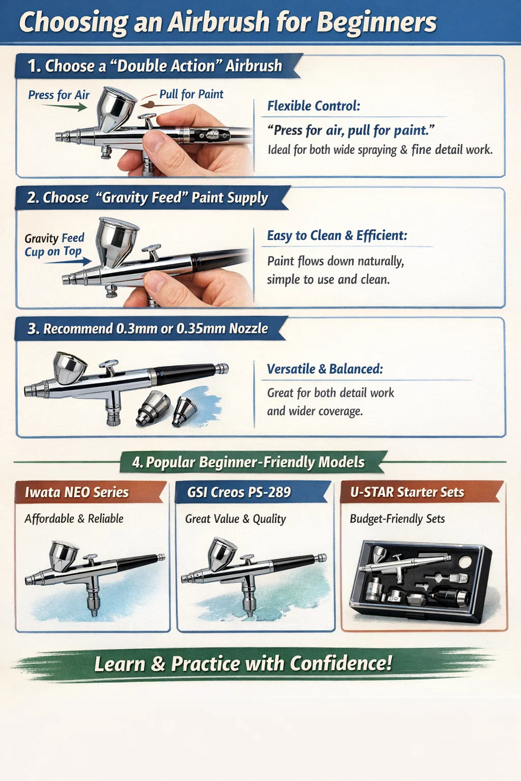 Iwata NEO serisi: Yeni başlayanlar için özel olarak tasarlanmış, uygun fiyatlı ve markanın birinci sınıf işçiliğini miras alan bir seridir. Atomizasyon etkisi çok kararlıdır ve birçok insan için ilk airbrush'tır. GSI Creos PS-289: Bu airbrush, paranızın tam karşılığını verir, hava akışı kontrolüne, dayanıklı parçalara ve basit bir sökme ve temizleme işlemine sahiptir. Model meraklıları arasında oldukça saygı görüyor.